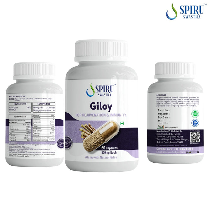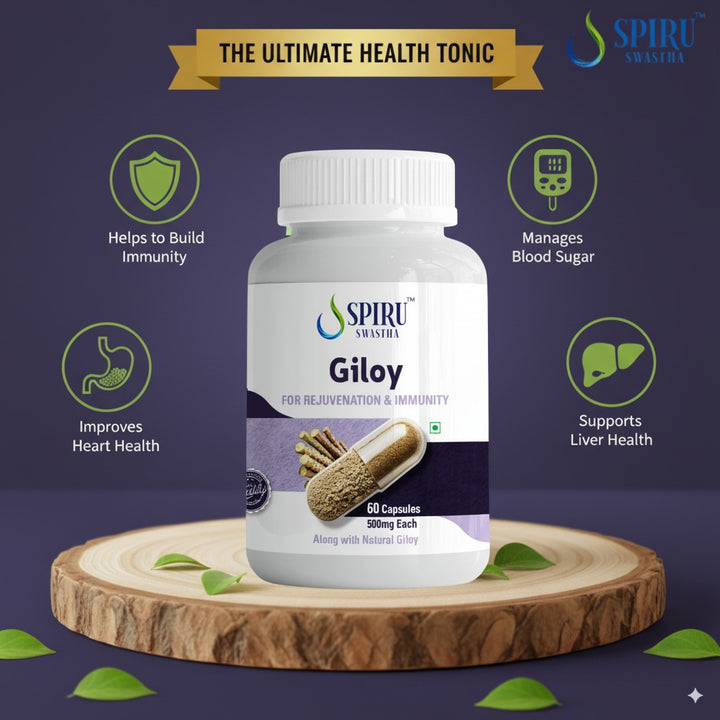 Spiru Swastha Giloy Capsules bring the ancient wisdom of Ayurveda into your daily routine with the goodness of pure Guduchi (Tinospora Cordifolia). Known for its immune-boosting and detoxifying properties, Giloy supports the body’s natural defense system while improving energy, digestion, and skin health. Its antioxidant and anti-inflammatory nature helps protect against infections, promotes joint flexibility, and balances overall wellness.