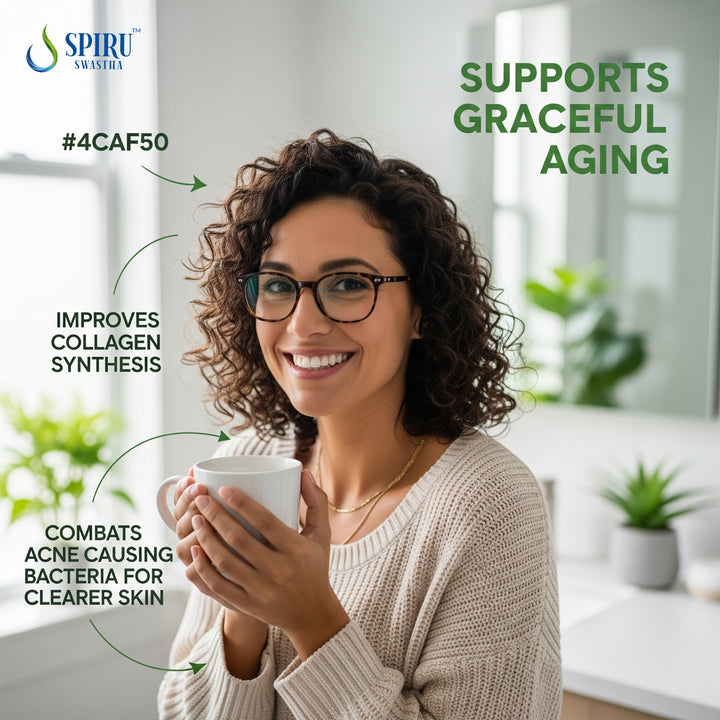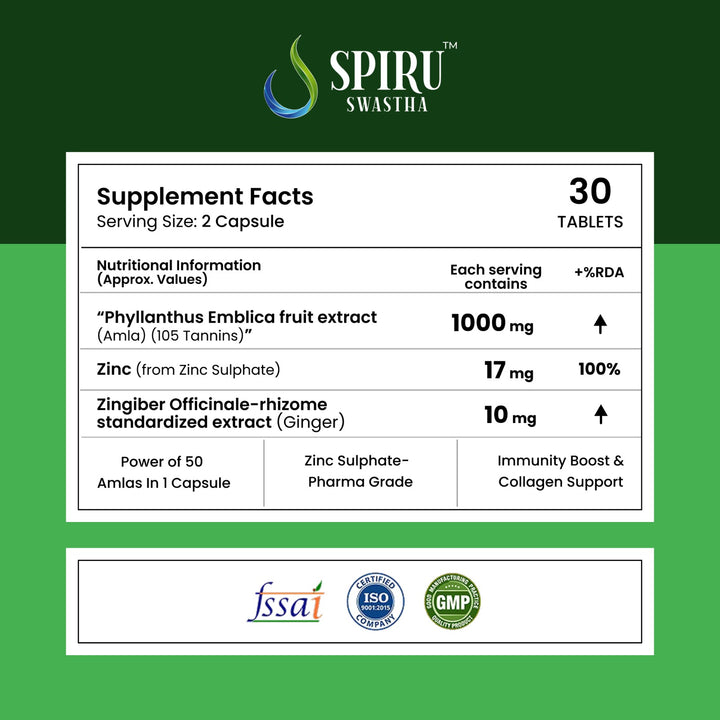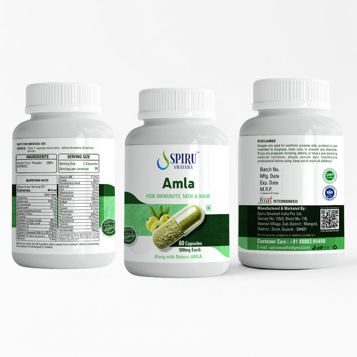 Spiru Swastha India’s Amla+ with Piperine is a premium herbal supplement crafted from 100% pure Ayurvedic ingredients. Packed with natural Vitamin C from Amla and enhanced with Piperine for improved digestion and nutrient absorption, this formula supports immunity, skin health, and hair strength. It acts as a potent antioxidant and anti-aging agent, helping combat oxidative stress and promoting overall vitality. Free from synthetic additives, it’s an ideal natural supplement for everyday wellness and energy support.
