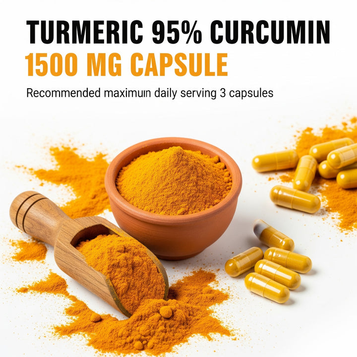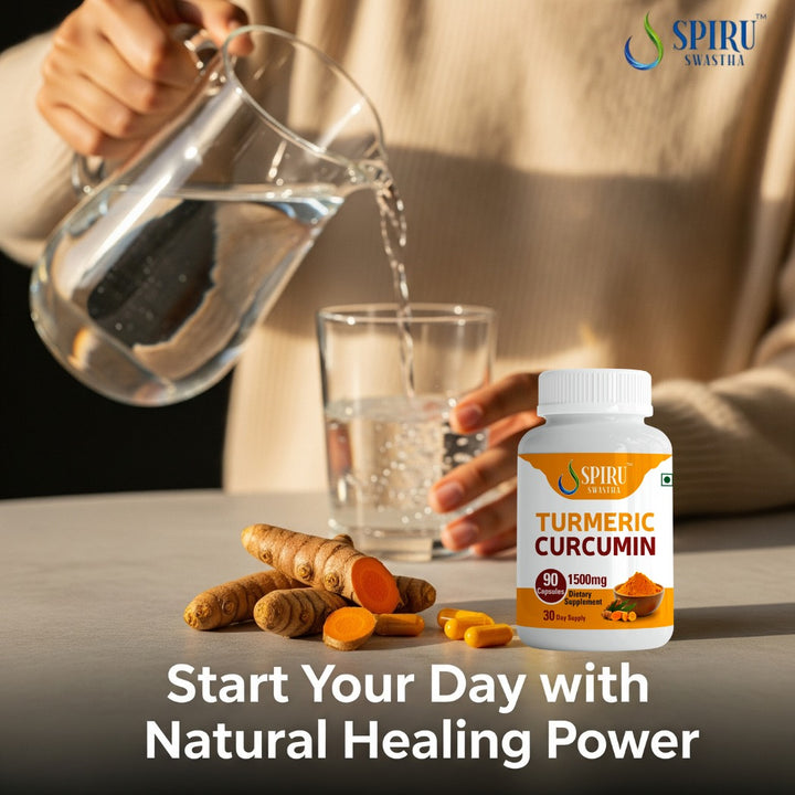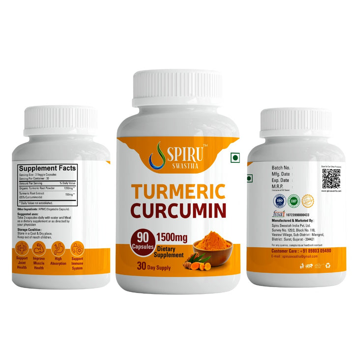 Experience the natural healing power of Spiru Swastha Turmeric Curcumin Capsules, enriched with Curcuma Longa, Ginger Extract, and Black Pepper (Piperine) for maximum absorption. With 95% Tetra-Hydro-Curcuminoids up to 250X stronger than regular turmeric it delivers 1500mg high-strength curcumin complex per serving to reduce inflammation, ease joint pain, improve mobility, and boost immunity. Enhanced with piperine for superior absorption, this Ayurvedic formula supports everyday comfort, flexibility, and overall wellness.